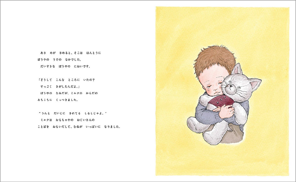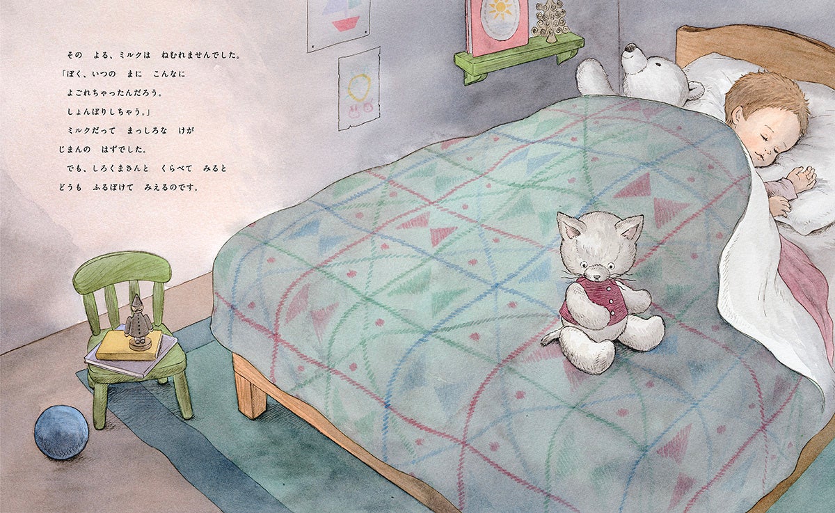 大好きな「ぼうや」と毎日を過ごす、しろねこの ぬいぐるみ「ミルク」。ある日、ぼうやのもとに、新しい しろくまの ぬいぐるみが、やってきました。