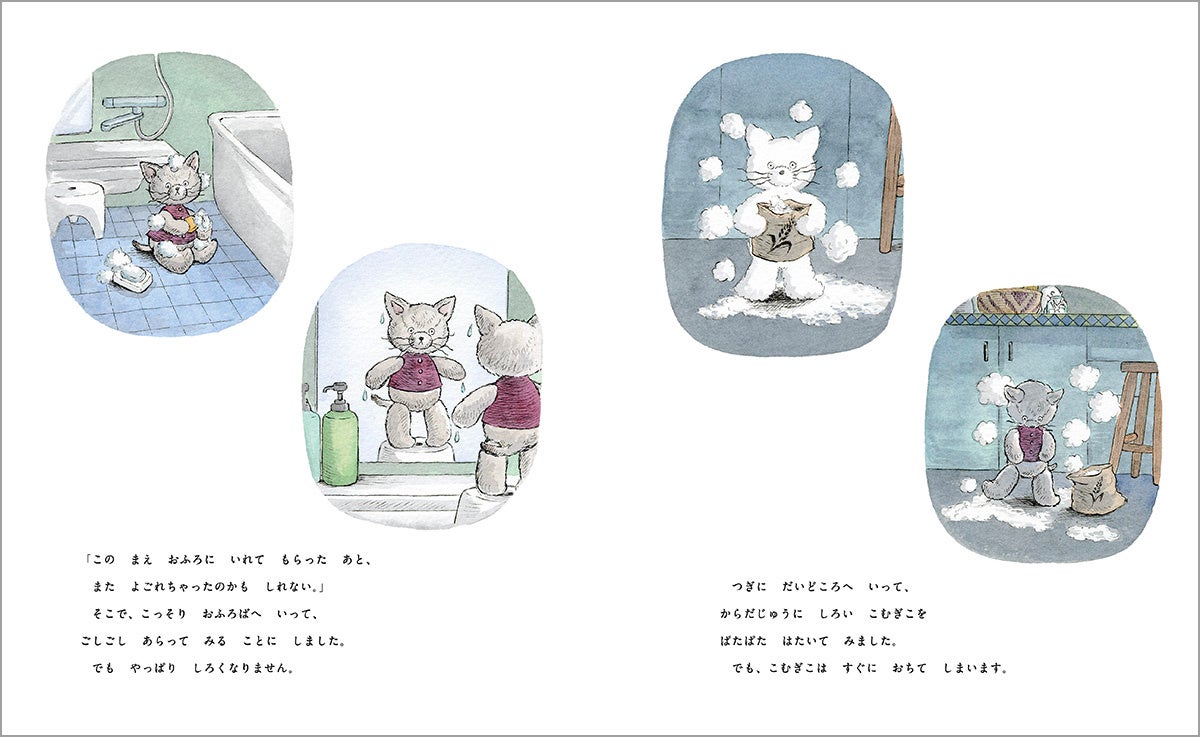 なんとか昔の真っ白な自分に戻ろうと、みんなが寝静まった夜に、ミルクは一人でお風呂に入ったり、体に白い粉をはたいたり…。ぼうやの前では、ぬいぐるみのミルク。けれど一人になるといきいきと動き出し、小さな体で不器用に一生懸命に奮闘する姿には胸がきゅんとなります。