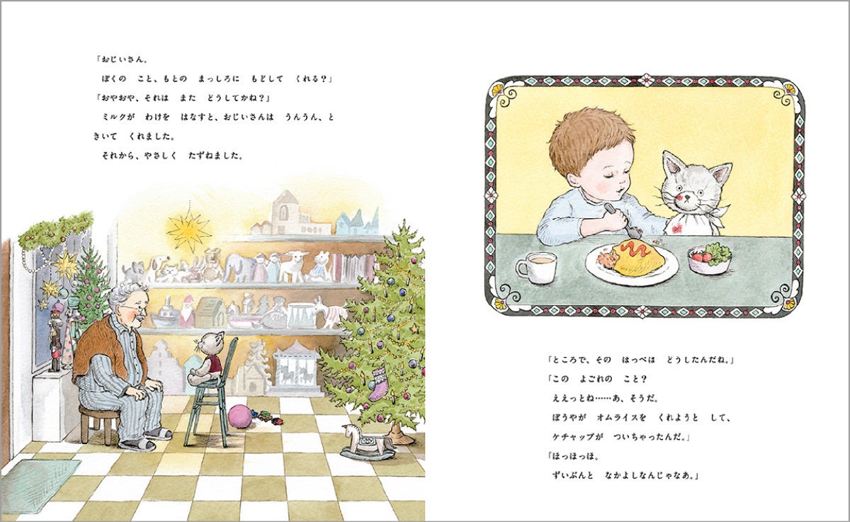 ミルクときちんと向き合い、話を聞いてくれるおじいさん。小さないすにちょこんと座り、おじいさんをまっすぐ見つめるミルクから、切実な思いが伝わってきます。