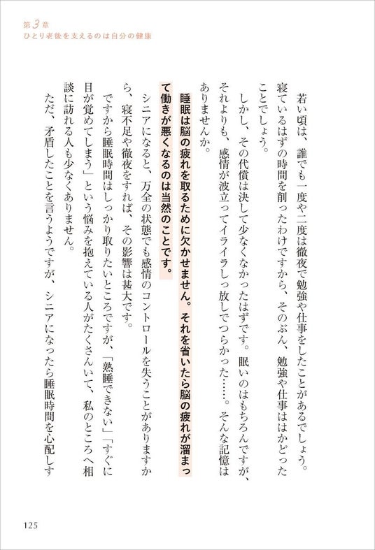 また、「長時間の睡眠は死のリスクを高める」といった最新の知見や、「人とのつながりを『0か100か』で考えない」といった高齢期特有の人間関係の距離の取り方、「『死の恐怖』と向き合うイメージトレーニング」など、ひとりでなくても老後に誰もが気になるさまざまな問題についても、専門医の視点でわかりやすく解説。ひとり老後に大きな不安を感じている方や、人生の最終コーナーで迷わないための道しるべがほしい方に、自信を持ってお薦めできる一冊となっています。