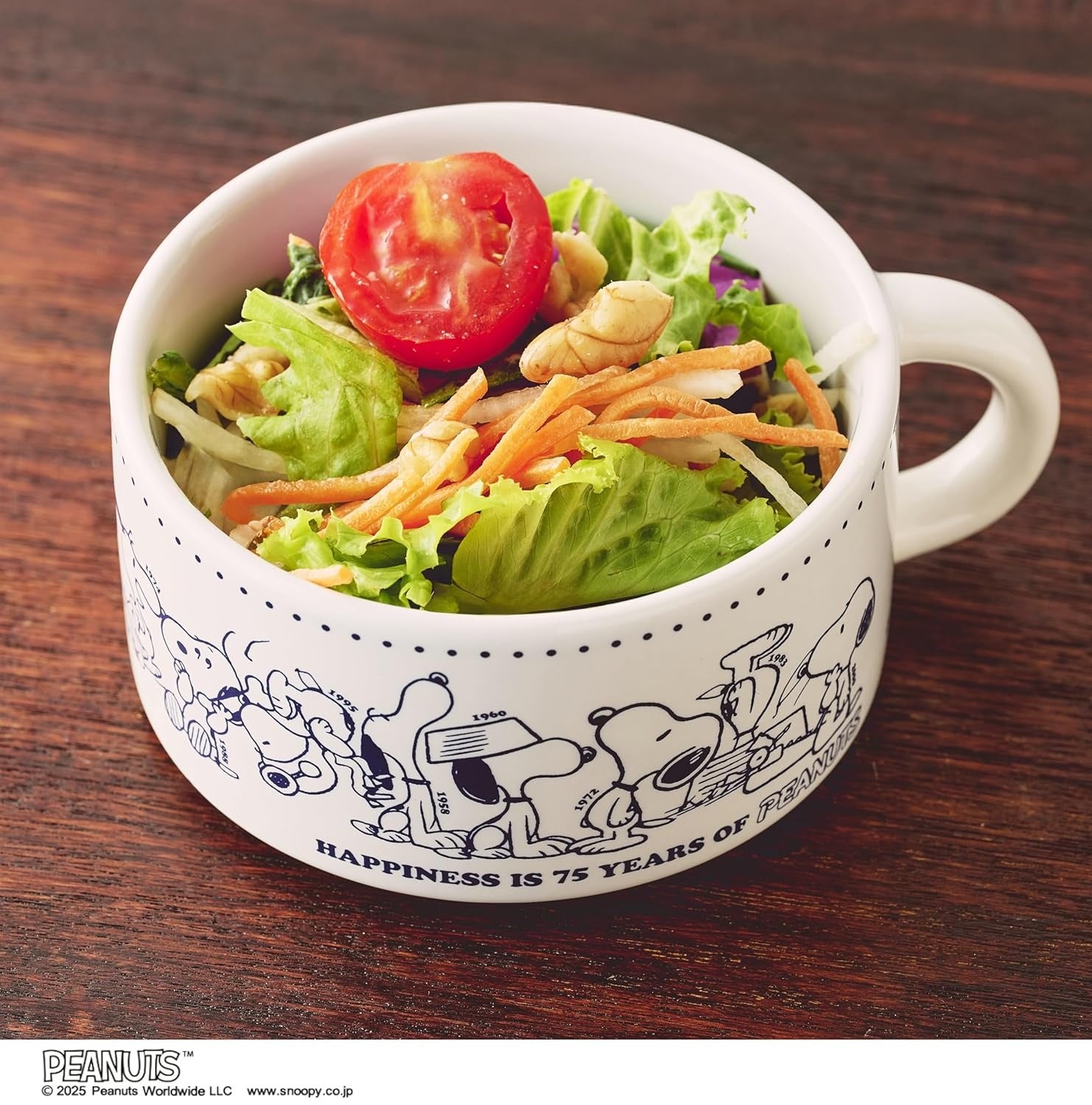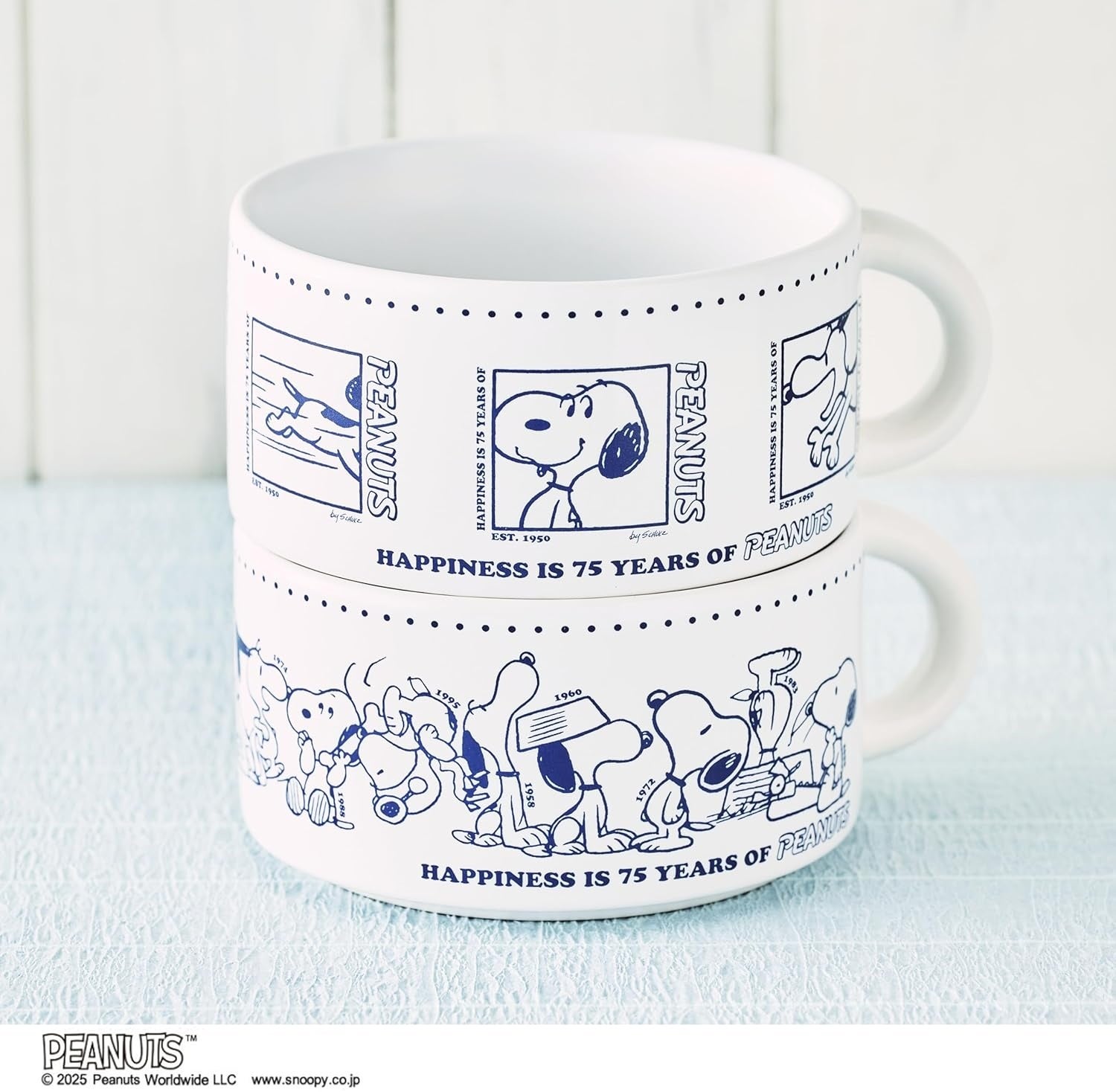 ひとつめのカップには、75周年記念アートより、1953年から2000年までの各年代のスヌーピーがずらりと並んでいます。もうひとつにも6つの年代のスヌーピーが!PEANUTSのこれまでの歴史を彩る歴代のスヌーピーが、表情豊かにあしらわれており、どちらも眺めているだけでもほんわか癒やされます。そして、口径が幅広に設計されているため、飲みものだけでなくヨーグルトやサラダを入れたり、小物入れとしてもぴったりです。