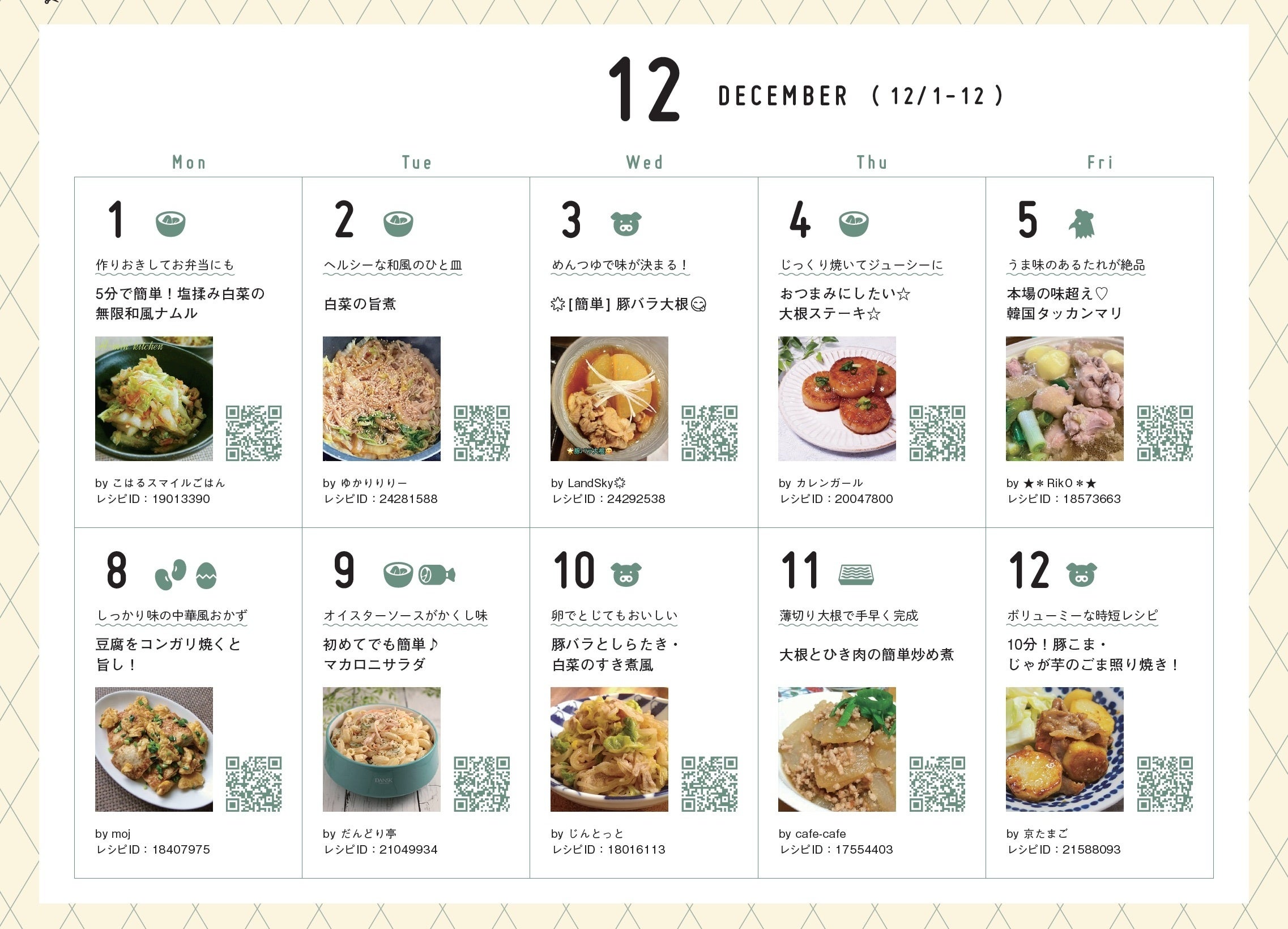 昨年の同じ日に「クックパッド」で、アクセスが集中したレシピをピックアップ!二次元コードを読み込めば、「その日の人気レシピ」が見られます。切り取って、キッチンに貼って使っても!