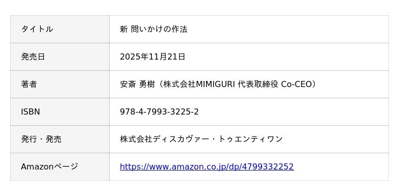 株式会社MIMIGURI(本社:東京都文京区、Co-CEO:ミナベトモミ、安斎勇樹、以下「MIMIGURI」)は、代表取締役 Co-CEO 安斎勇樹による新著『新 問いかけの作法』(発行・発売:ディスカヴァー・トゥエンティワン)が、2025年11月21日(金)より販売開始されたことを発表いたします。