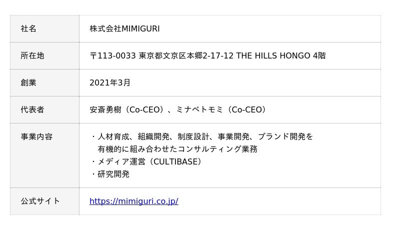 MIMIGURIは、文部科学省認定の研究機関として、組織の創造性を賦活する最新理論を実践し、社会の変革を促す経営コンサルティングファームです。デザイナー、ファシリテーター、エンジニア、コンサルタント、研究者など多様な専門家が連携し、人材育成、組織開発、制度設計、事業開発、ブランド開発を有機的に組み合わせたコンサルティングサービスを提供しています。さらに、人と組織の総合知を発信する探究メディア「CULTIBASE」の運営にも取り組んでいます。
