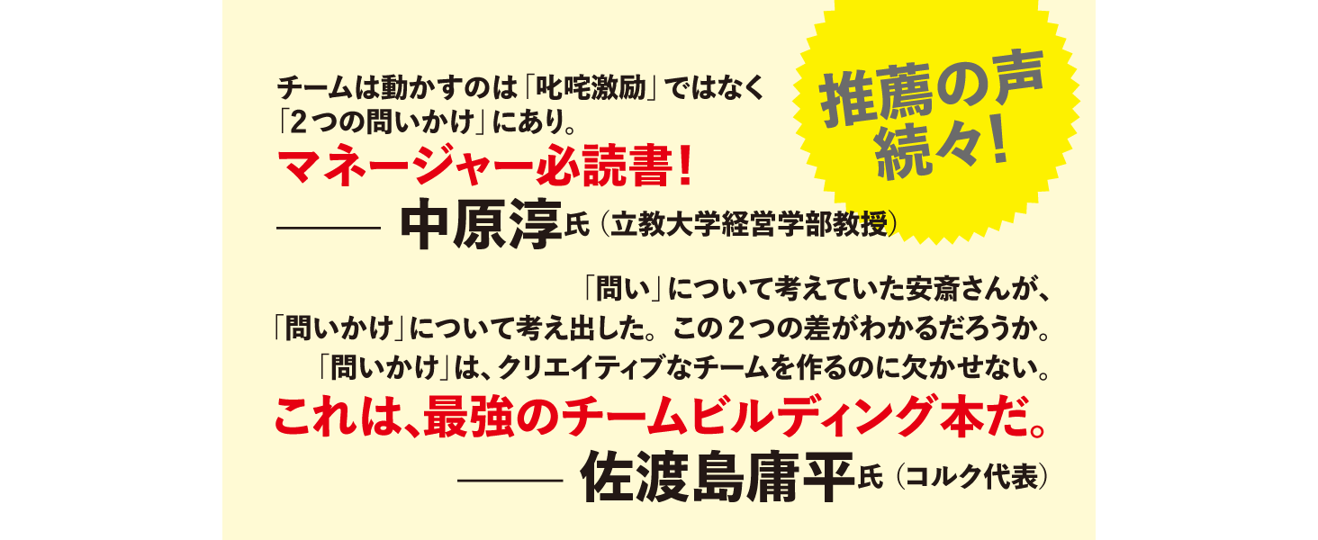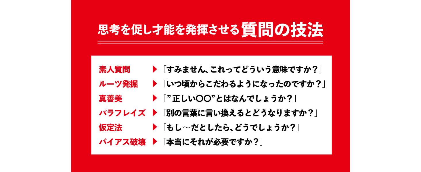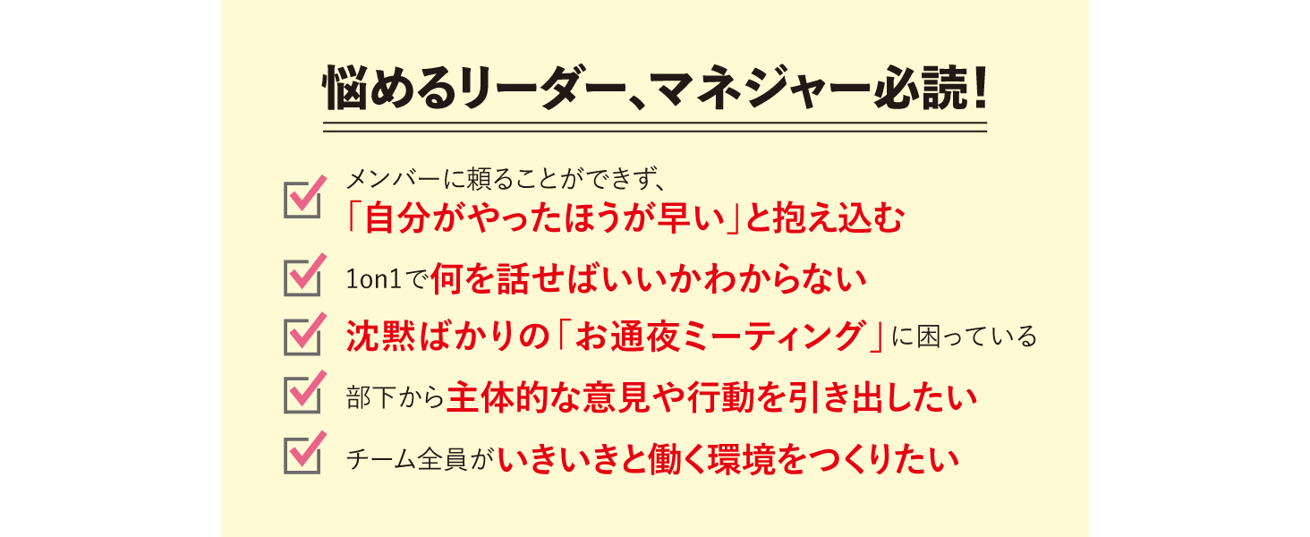 1on1や会議でチームを蝕む “4つの現代病” を乗り越え、メンバー一人ひとりの創造性とポテンシャルを解放する「問いかけ」を、”3つの作法のサイクル” や ”4つの基本定石” など、誰にでも習得可能なスキル・具体的な方法論として体系化してわかりやすくまとめました。