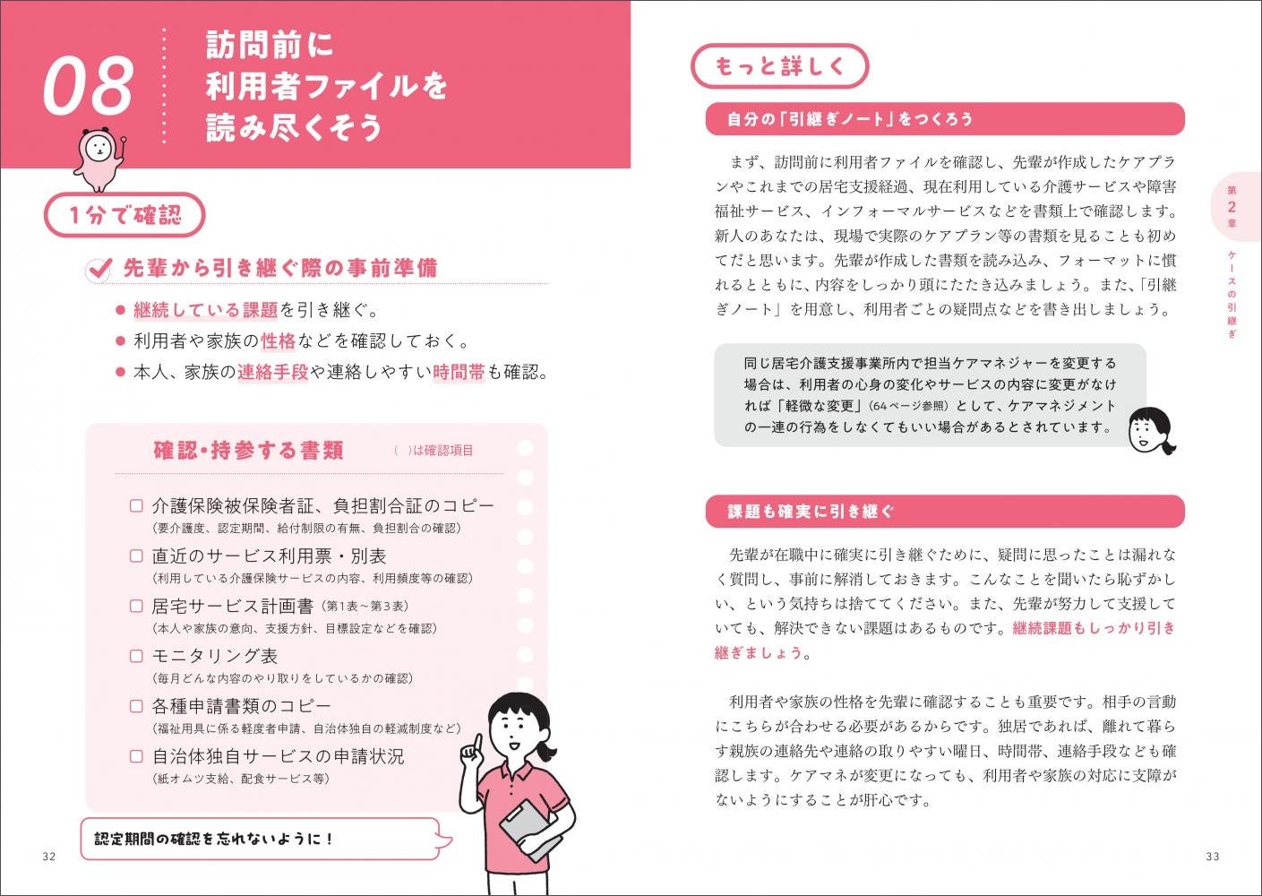 新人はいきなり新規ケースを任せられるより、前任の引継ぎからスタートすることが多いので、その際のノウハウから丁寧に解説します。他機関との連携や、業務効率化のコツ、良好な人間関係を築くための対応方法なども収録しています。