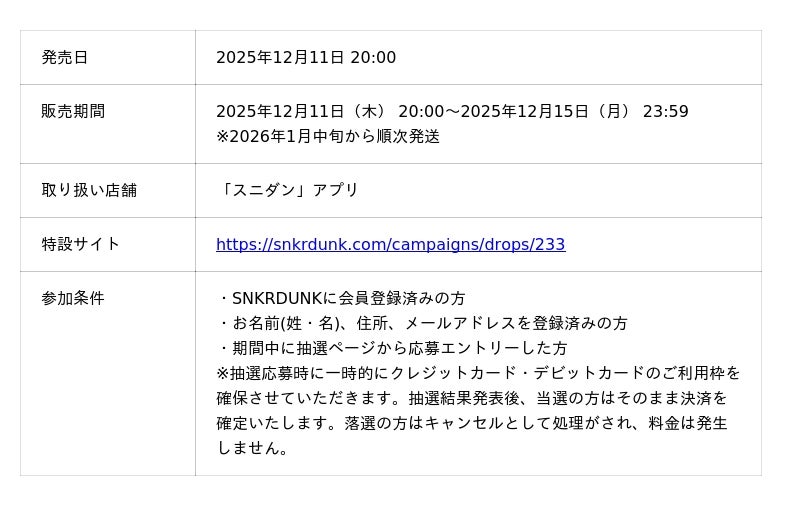 ~12月11日(木)よりスニダンアプリにて抽選販売開始~