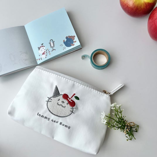 レミーとロミーのお顔がそれぞれ刺繡されているフラットポーチは絵本の表紙を基調としたカラーリングが特徴です。ステーショナリーやメイクアイテム、小物などを入れるのに丁度いい大きさで持ち運びにも便利な手のひらサイズのポーチです