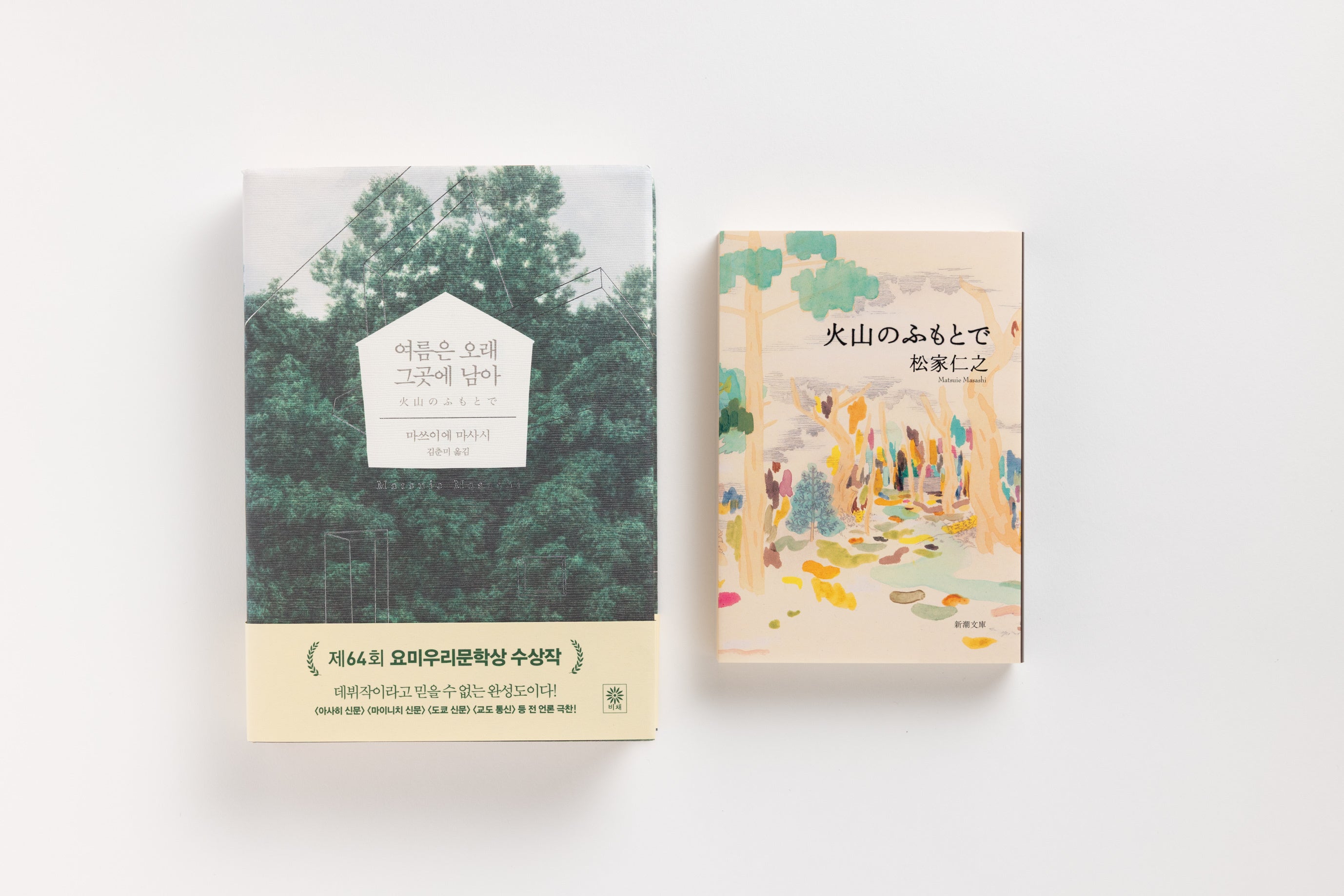 韓国語版『火山のふもとで』(左)/新潮文庫刊『火山のふもとで』(右)