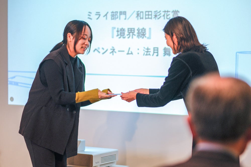 左から審査員の和田彩花さん、『光の向こうに見えたもの』/Ryoさん(リアル部門)、『生きるための一歩』/横山 シシファ美麗さん(ミライ部門)、審査員の樋口恭介さん