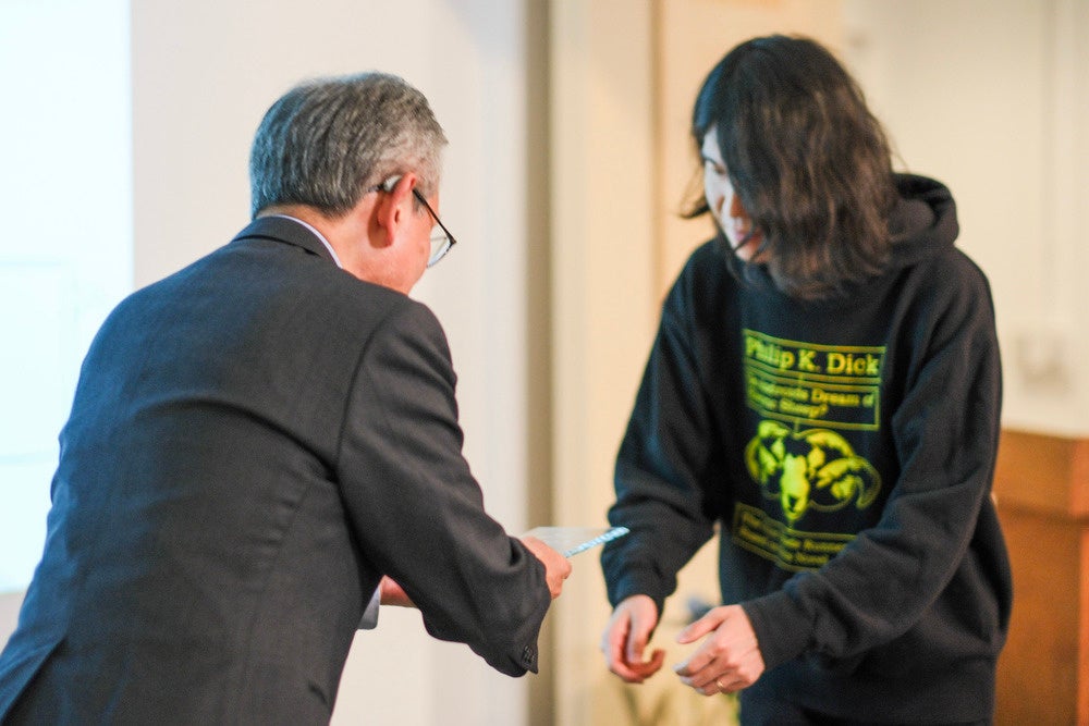 トロフィーを授与する樋口恭介さん