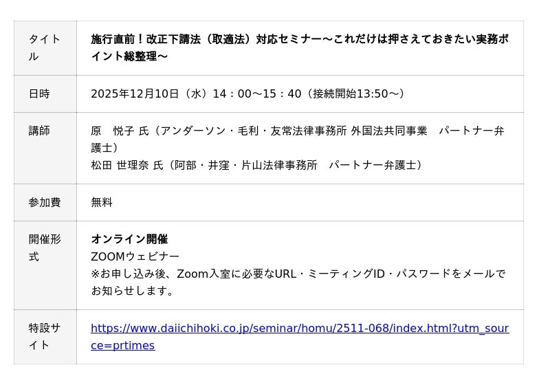 【12月10日開催|無料セミナー】施行直前!改正下請法(取適法)対応セミナー~これだけは押さえておきたい実務ポイント総整理~
