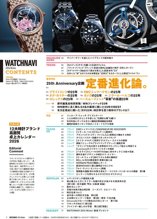 松山 猛氏と名畑政治氏が時計と文化を尋ねて各地を巡る「風来旅日記」や世界視点での時計トレンドを分析する「Chrono24 グローバル動向2025年レポート」など連載記事は今回も興味深いトピックスを掲載。高橋和幸カメラマンによる連載「ウオッチのWA!!!!!!」には現在の卓球人気の礎を築いた“愛ちゃん”こと福原 愛さんが出演しています。別冊付録は毎年恒例「12大時計ブランド高画質卓上カレンダー 2026」。ぜひ2026年の時計生活を楽しくするアイテムとして1年通してご活用ください!