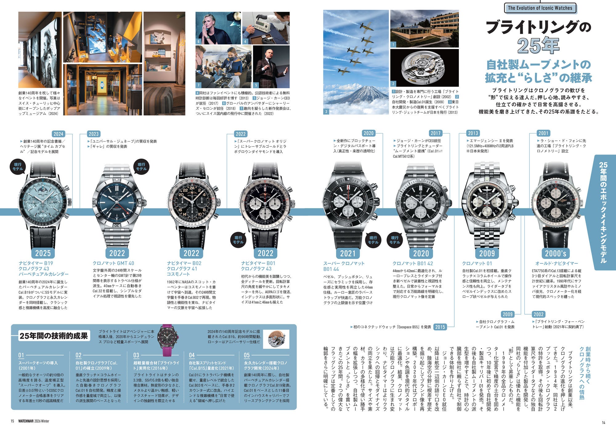 WATCHNAVIの創刊100号を記念して、ブライトリング、IWCシャフハウゼン、タグ・ホイヤー、ジラール・ペルゴ、オメガ、ロレックスといった人気ブランドの秘蔵写真とともに、時計界に燦然と輝き続ける定番ウオッチの25年の歴史を振り返ります。さらに21世紀から急速に普及していったマニュファクチュールムーブメントの進化の系譜からトレンドを読み解くコラムや歴代編集長からの特別寄稿、有名正規店店長による次世代定番大予測など、新旧織り交ぜた情報満載のスペシャル企画となっています。