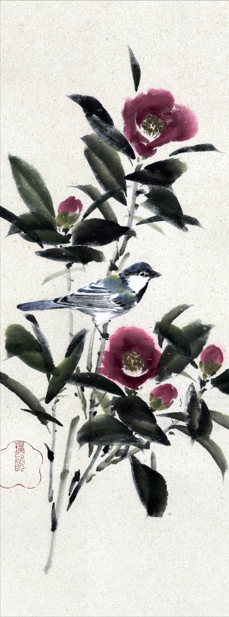 『雪椿に四十雀』墨 顔彩 和紙 62×23cm