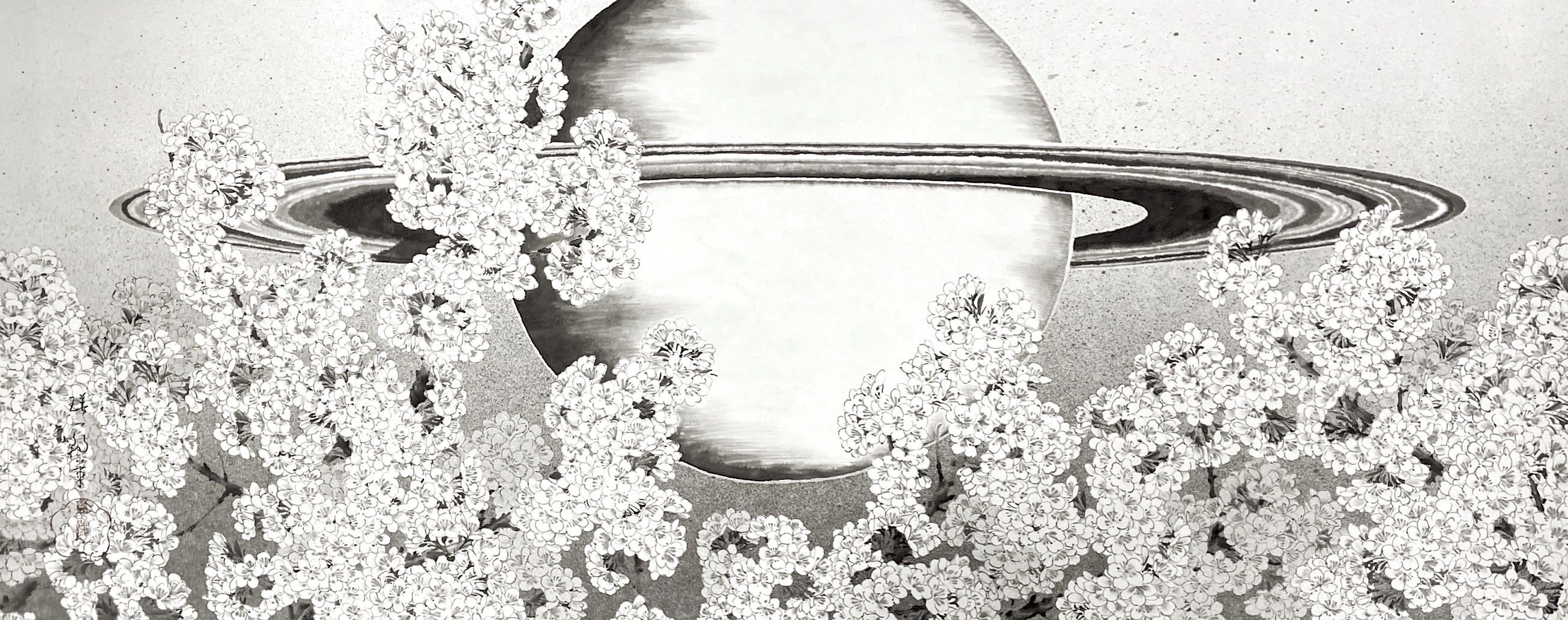 『桜に土星』墨 顔彩 和紙 60×125cm