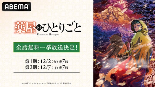 新しい未来のテレビ「ABEMA」は、大人気アニメ『薬屋のひとりごと』第1期、第2期を、2025年12月2日(火)より順次全話無料一挙放送いたします。