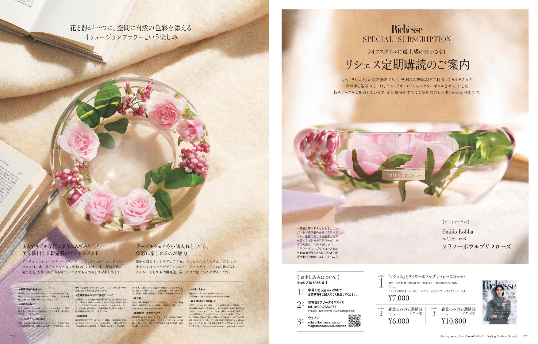 毎号スペシャルなアイテムがセットになって届く『リシェス』の定期購読。今回のセットアイテムは、「エミリオ・ロバ」のフラワーボウルプリマローズです。部屋を彩るインテリアのアクセントになるのはもちろん、アクセサリーなどの小物を入れるトレーとしても活用可能なお部屋に華やぎをもたらす、エレガントで透明感のあるフラワーボウルをぜひ雑誌の年間定期購読(1年・4冊)と共にお楽しみください。