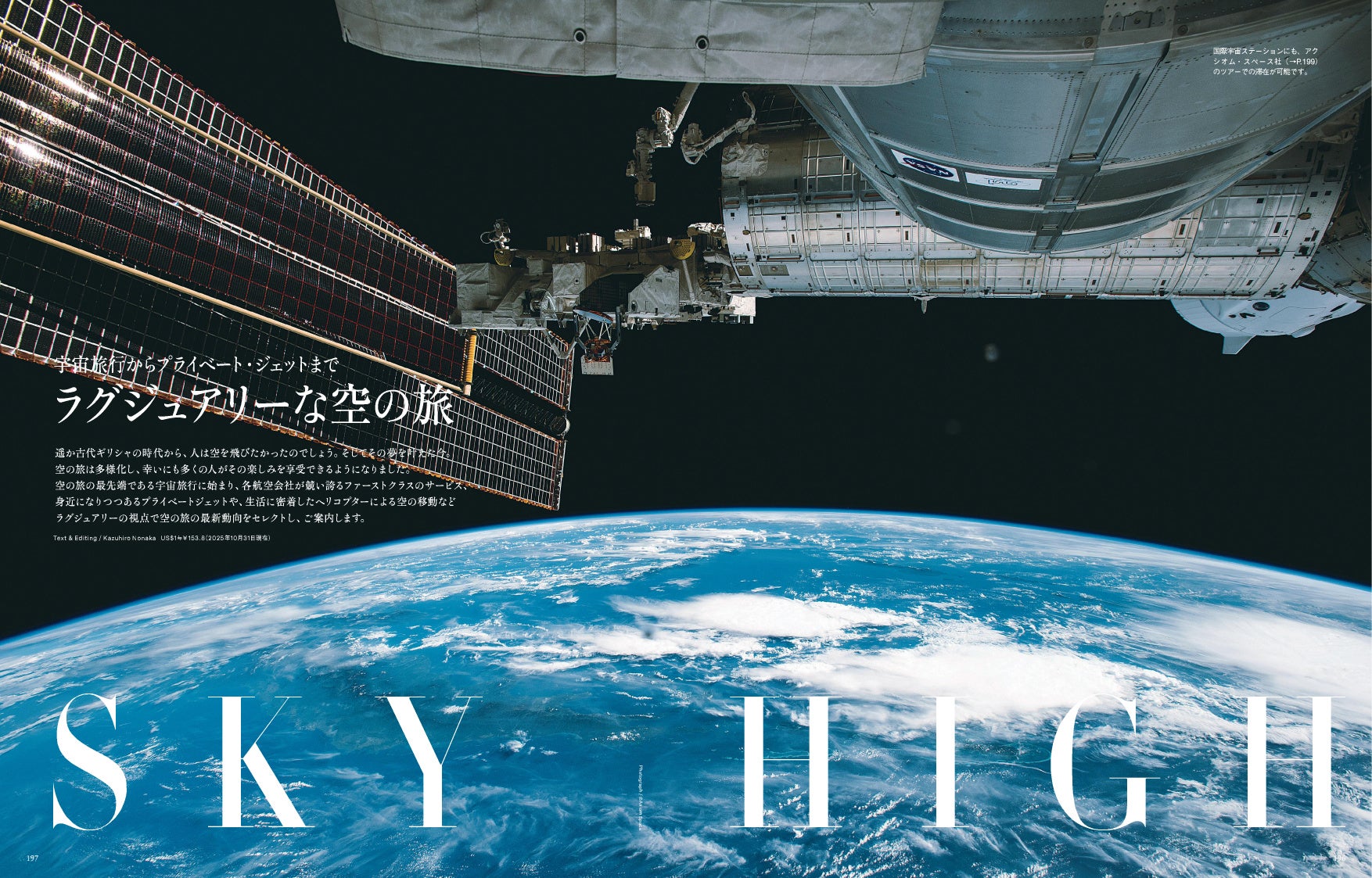 遥か古代ギリシャの時代から、人は空を飛びたかったのでしょう。そしてその夢を叶えた今。 空の旅は多様化し、幸いにも多くの人がその楽しみを享受できるようになりました。 空の旅の最先端である宇宙旅行に始まり、各航空会社が競い誇るファーストクラスのサービス、 身近になりつつあるプライベートジェットや、生活に密着したヘリコプターによる空の移動などラグジュアリーの視点で空の旅の最新動向をセレクトし、ご案内します。