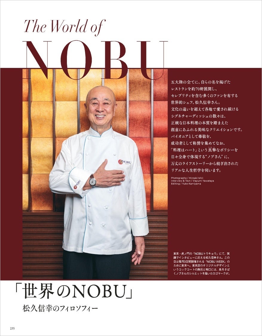 五大陸の全てに、自らの名を掲げた レストランを約70軒展開し、 セレブリティを含む多くのファンを有する世界的シェフ、松久信幸さん。 文化の違いを超えて各地で愛され続けるシグネチャーディッシュの数々は、正統な日本料理の本質を踏まえた創意にあふれる美味なクリエイションです。 パイオニアとして尊敬を、成功者 として称賛を集めてなお、「料理はハート」という真摯なポリシーを日々全身で体現する“ノブさん”に、万丈のライフストーリーから紡ぎ出されたリアルな人生哲学を伺います。