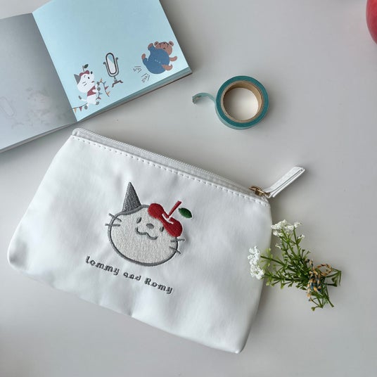 レミーとロミーのお顔がそれぞれ刺繡されているフラットポーチは