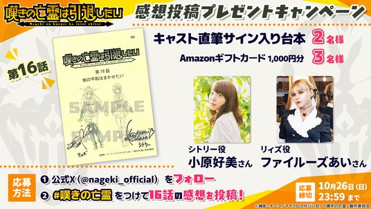 第16話の放送を記念して、ファイルーズあいさん(リィズ・スマート役)、小原好美さん(シトリー・スマート役)の直筆サイン入り台本やAmazonギフトカード1,000円分が当たるキャンペーンを開催します。